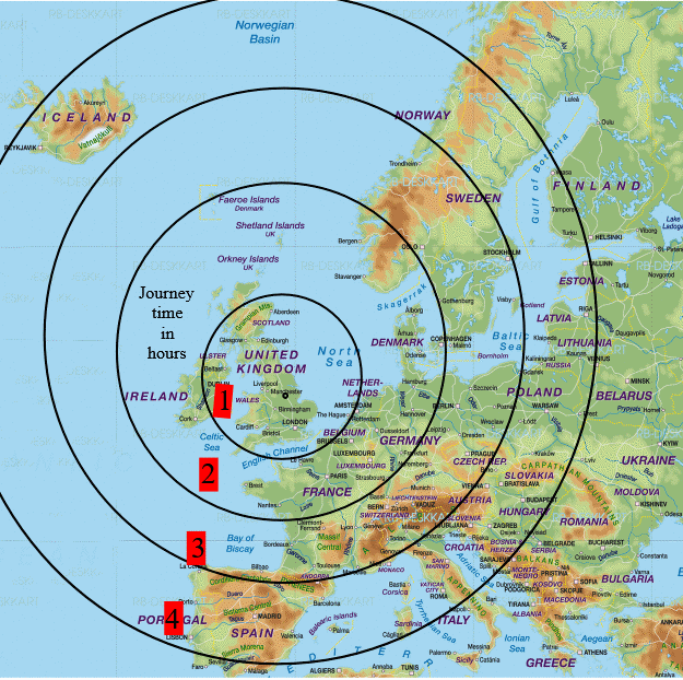 The map below gives example journey times from a central starting point in the UK. Actual journey times can sometimes vary depending on wind direction and strength and airspace restrictions.